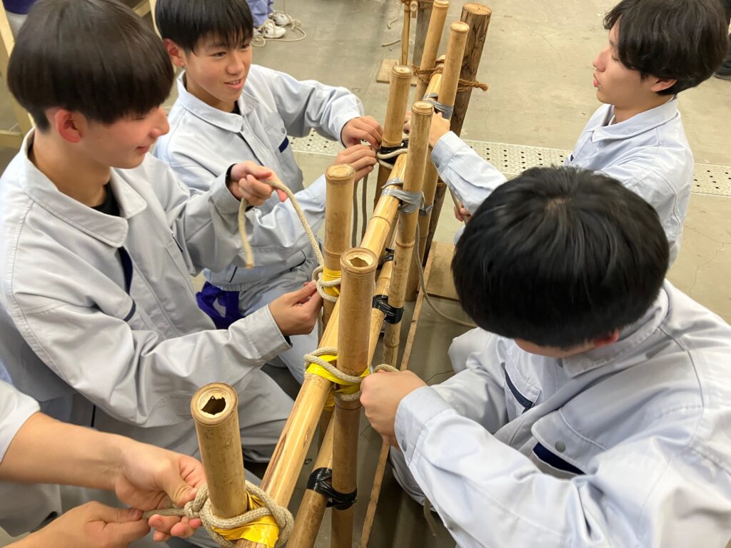 現在「総合実習」の授業で、造園緑地科1・2年生がロープワークの習得を行っています。
