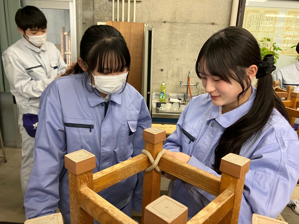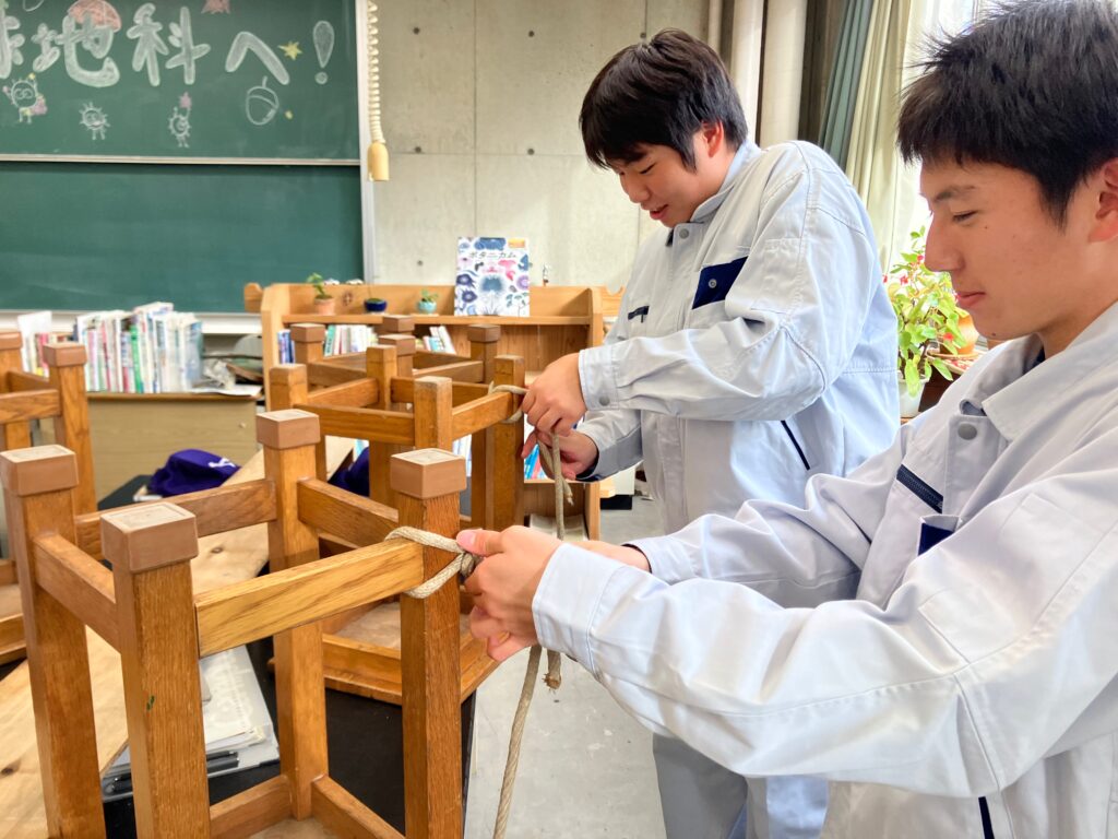 1年生はロープを使用しますが、2年生になるとシュロ縄(ヤシの樹皮を原料として撚(よ)り合わせた縄)や荒縄を使って結束し、さらに四ツ目がらみ(からげ結び)が増えるので難易度が上がります。夏に実施される造園技能検定では竹垣作製の際に必須となる技術なので、みんな頑張って習得しています。