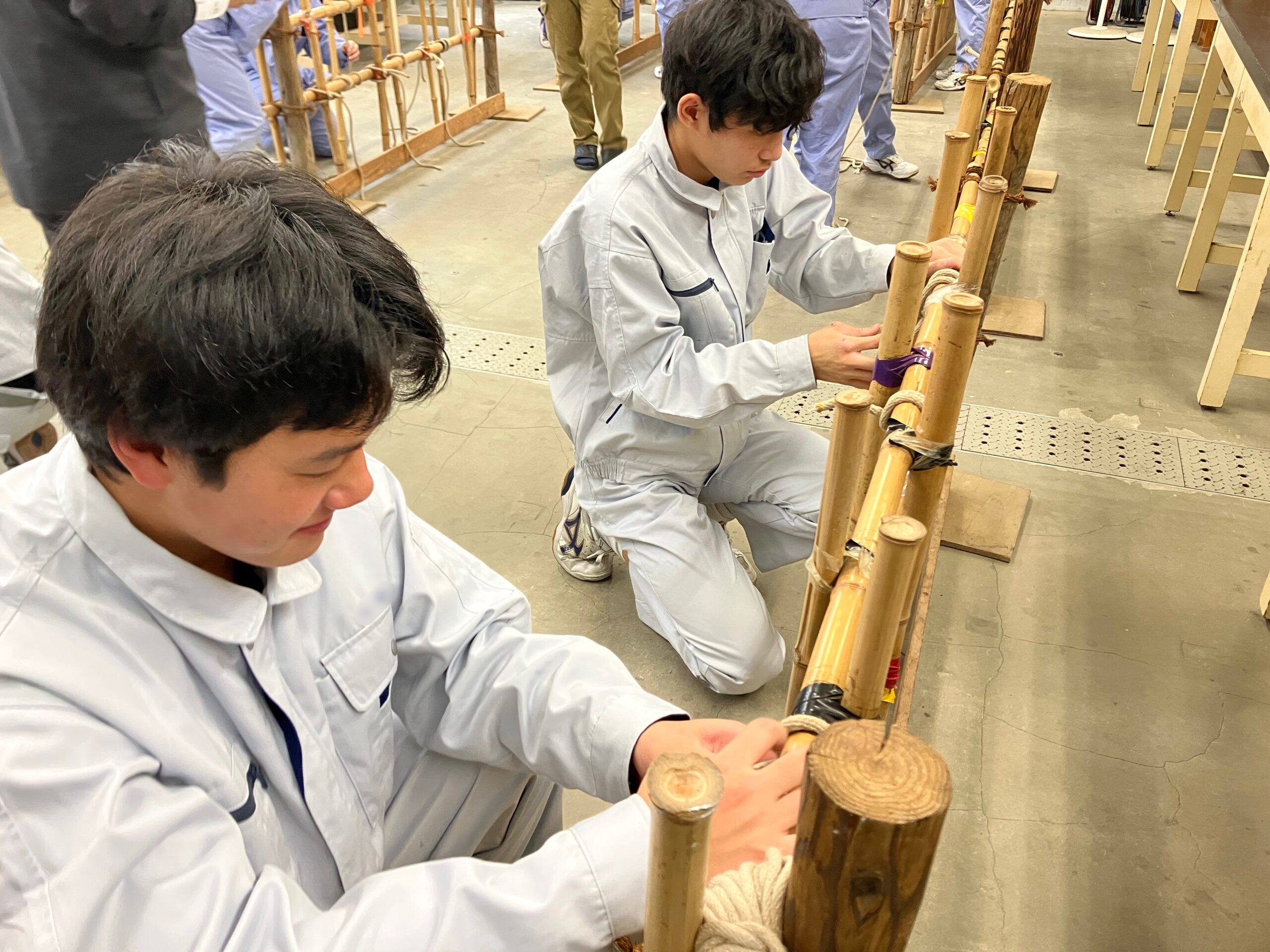 1年生はロープを使用しますが、2年生になるとシュロ縄(ヤシの樹皮を原料として撚(よ)り合わせた縄)や荒縄を使って結束し、さらに四ツ目がらみ(からげ結び)が増えるので難易度が上がります。夏に実施される造園技能検定では竹垣作製の際に必須となる技術なので、みんな頑張って習得しています。