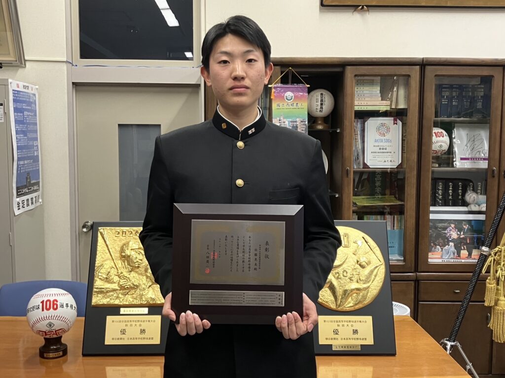 日本学生野球協会表彰 学校生活・農場 2026.02.05 日本学生野球協会表彰選手〈高校の部〉として、本校野球部前主将佐藤晃真(3年生物資源科)さんが選出されました! 1月23日(金)、秋田県高等学校野球連盟の田口康会長から表彰状を手渡されました。 ~佐藤さん感想~今回このような賞を受賞することができて、とても嬉しいです。いただいて改めて賞の重さを感じました。大学へ進学しても、多くの人に支えられていることに感謝し、頑張っていきたいと思います。