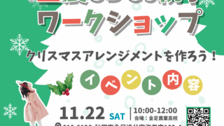 お知らせ 「金農SDGs親子ワークショップ」参加者の募集について 親子でクリスマスにぴったりなアレンジメントを作ってみませんか?剪定管理の際に発生する枝葉や実などの“廃材”で、クリスマスアレンジメントを製作します。これは、3年造園緑地科「課題研究」の授業の一環として行うもので、高校生が先生役を担います。ご... 2025.10.01 お知らせ造園緑地科